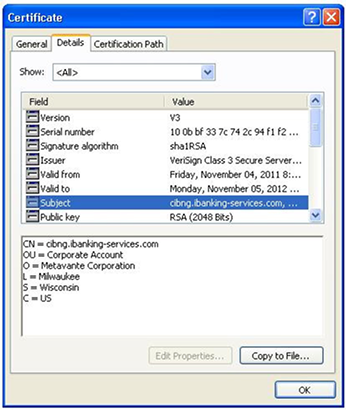 - Presiona la pestaña de "certification Path" y selecciona por ejemplo, cibng.ibanking-services.com En el recuadro de "Certificate status" debe aparecer un mensaje que diga "This Certificate is OK" según se muestra en la imagen de abajo.