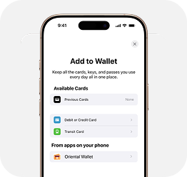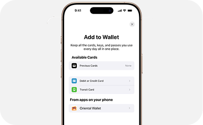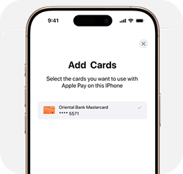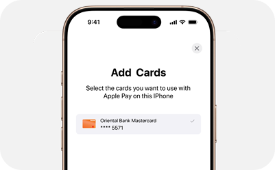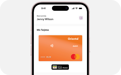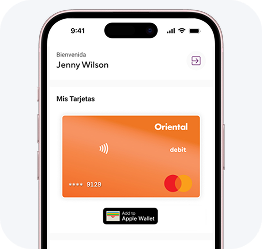 (1) El uso de Apple Pay está sujeto al balance disponible en la tarjeta de crédito o débito atada al Apple Wallet. La región configurada en el dispositivo debe ser una región donde Apple Pay haya sido implementado. Para efectuar transacciones por Apple Pay se requiere de un dispositivo móvil con acceso a Internet. Cargos por mensajes y datos del proveedor de servicios inalámbricos podrían aplicar. Visita la página web de Apple Support para conocer los dispositivos compatibles y la lista de regiones con el servicio. Al momento Apple Pay no está disponible en la región de USVI. Oriental Bank no se hace responsable de fallas con proveedores que pudieran afectar la transaccionalidad del servicio. Nos reservamos el derecho de eliminar el uso de estos proveedores a nuestra discreción. Apple Payments Services LLC, es una subsidiaria de Apple Inc. El logo de Apple, Apple, Apple Wallet, iPhone, iPad, Apple Pay, Apple Watch, Face ID, Touch ID y Mac son trademarks de Apple Inc.