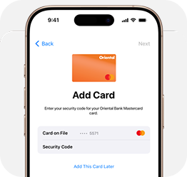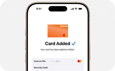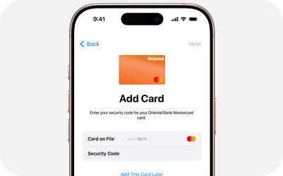 Mastercard® es una marca comercial registrada de Mastercard International Region LAC y es utilizada por el emisor bajo licencia. Google y Google Play son marcas de Google, Inc. Samsung y Samsung Pay son marcas registradas de Samsung Electronics Co., Ltd. Fitbit es una marca registrada de Fitbit LLC. Garmin es una marca registrada de Garmin Ltd. Apple Payments Services LLC, es una subsidiaria de Apple Inc. Apple, el logo de Apple, iPhone, iPad, Apple Pay, Apple Watch, Face ID, Touch ID and Mac son trademarks de Apple Inc. Visita la página web de cada proveedor para conocer los dispositivos compatibles con el servicio. Los productos de crédito no están garantizados ni asegurados por el FDIC. Oriental Bank, Miembro FDIC.